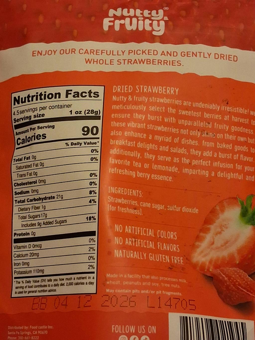 Strawberries, Organic Cane Sugar, Citric Acid, Sulphur Dioxide for freshness. Product of Thailand.